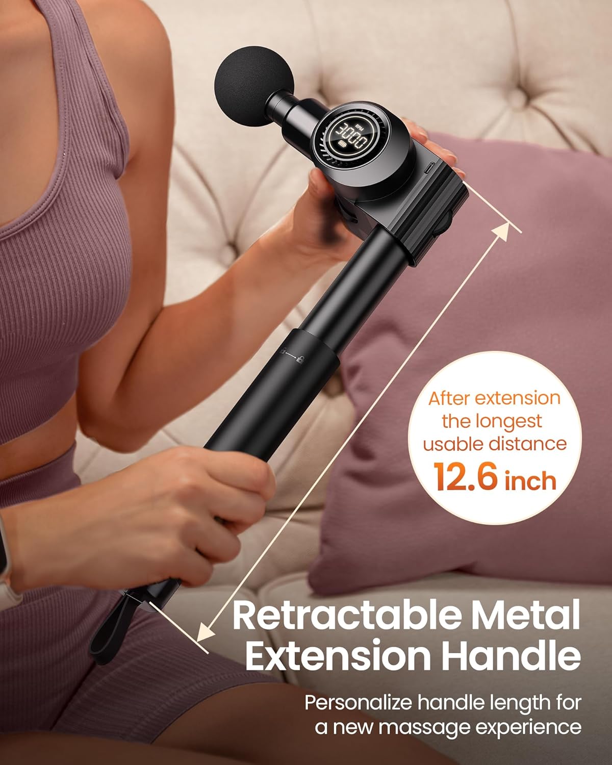 ✨Extendable Handle & 2‑in‑1 Modes: Switch effortlessly between a handheld massage gun and a long‑handle massage gun by simply rotating the metal rod. The extendable handle adjusts from approximately 8.7″ to 12.6″ (22‑32 cm), allowing you to easily reach your back and other hard‑to‑access areas for a complete, independent full‑body massage.