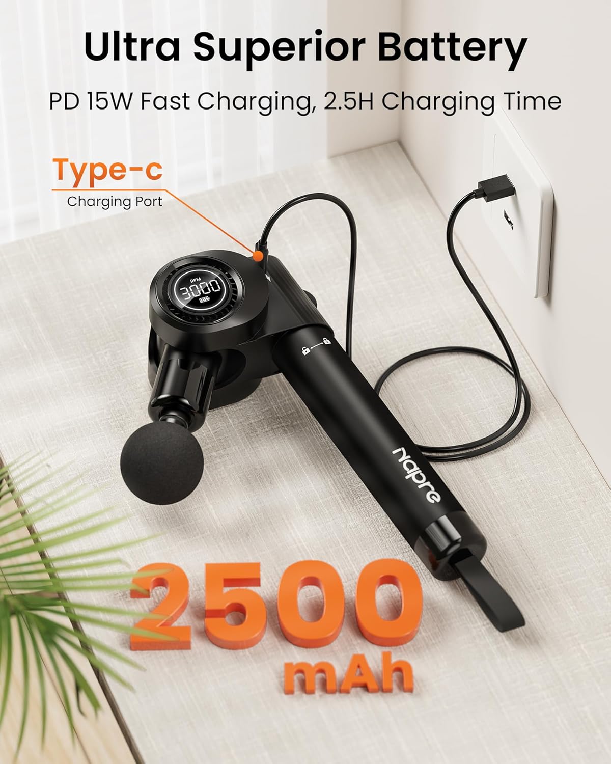 ✨Fast Charging & Long‑Lasting Battery: Muscle massage gun with USB‑C PD 15W fast charging, the 2500mAh battery recharges fully in just 2.5 hours. Enjoy over 3 hours of cordless use for recovery anytime, anywhere.