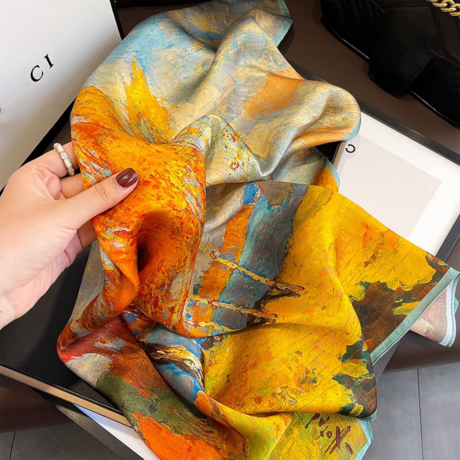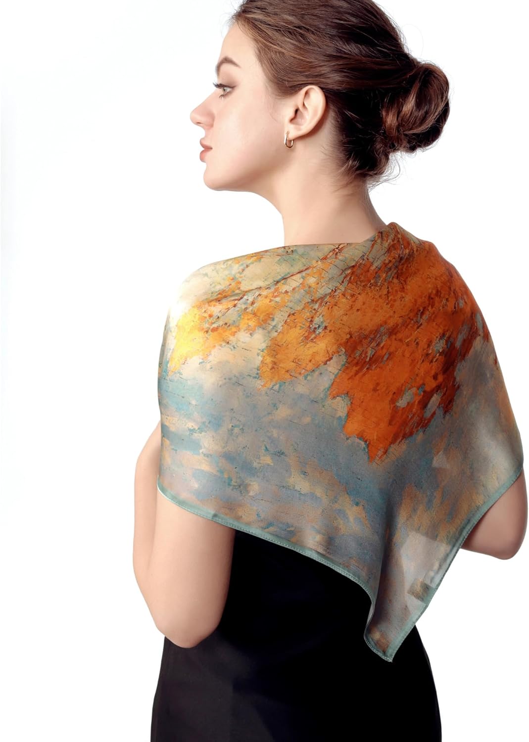 Fashion classy silk square scarves can be used as hair scarf, shawls, beanie, pirate, handbag accessory, hat decoration, cowboy neckerchief, headband, wrist wrap, waist band, decorations, hair accessories, etc. Suitable for business, commuting, party, travel, leisure, holiday, gifts.