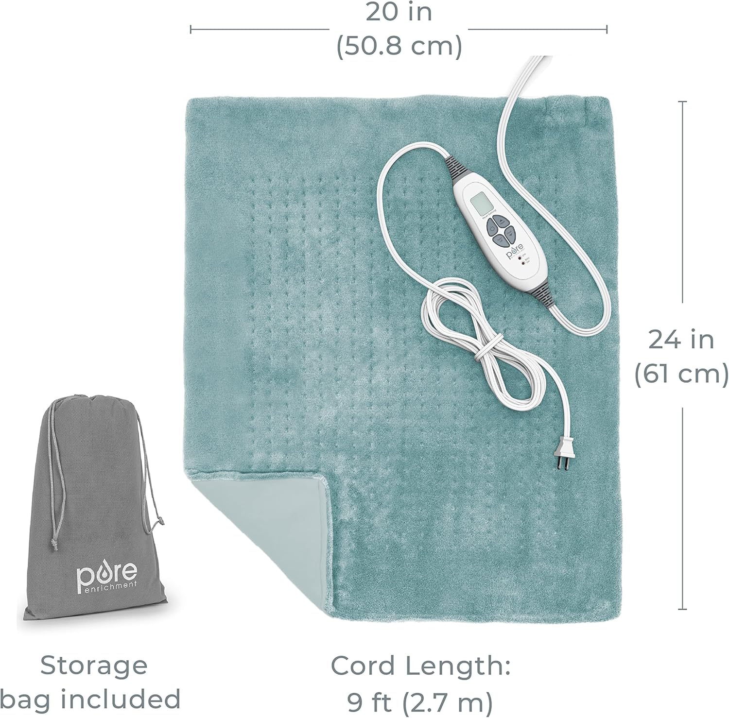 Pure Enrichment PureRelief Ultra-Wide Microplush Heating Pad – 20” x 24” XXL Size & 6 Heat Settings for Temporary Neck, Shoulder & Back Pain Relief – Moist Heat Option & Machine Washable (Sea Glass)