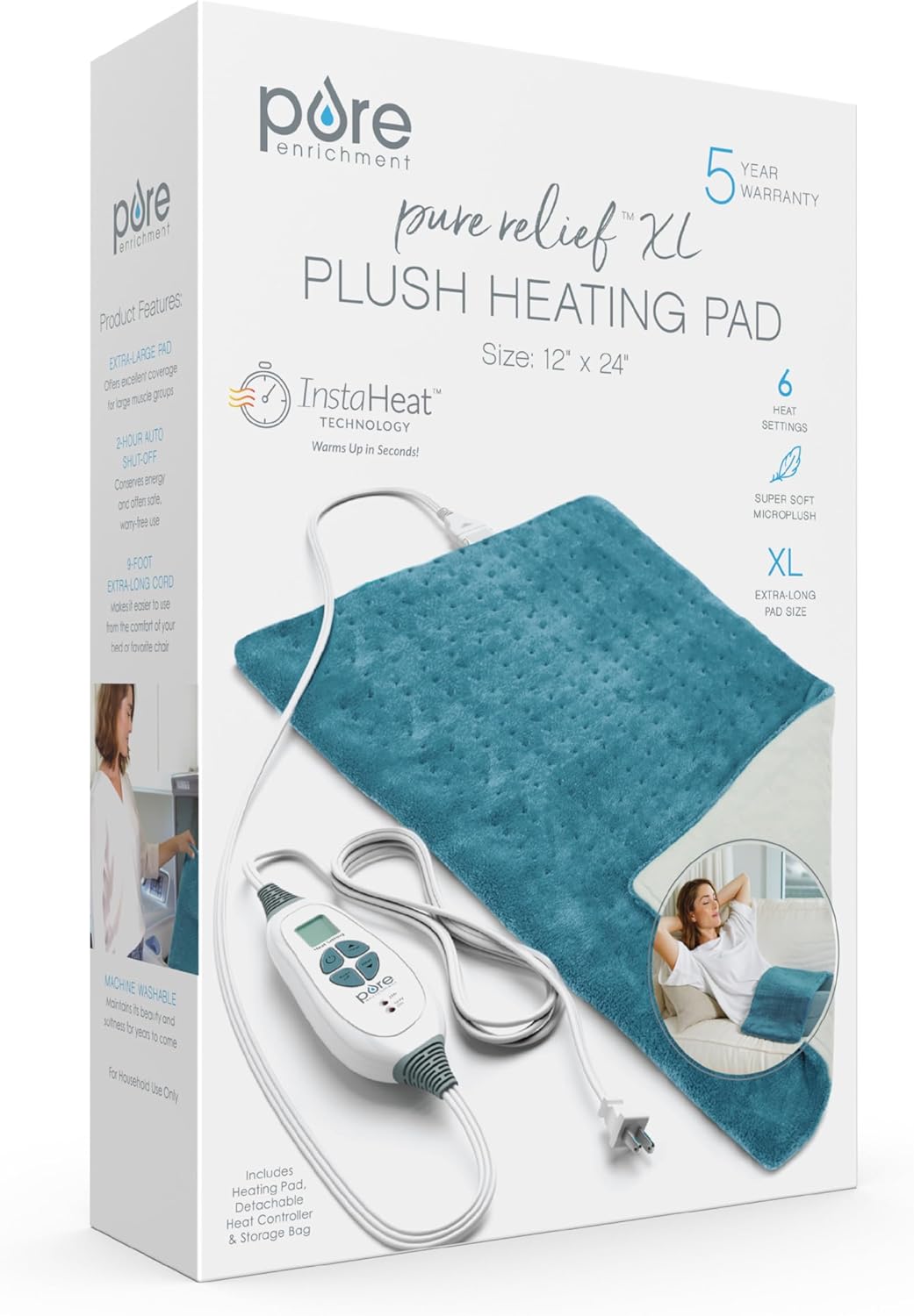 What You Get: Electric heating pad with a detachable LCD controller, storage bag, and Pure Enrichment’s guaranteed 5-Year Manufacturer’s Warranty. Our customer support team provides daily quality service and peace of mind to millions worldwide all from a brand you can trust.
