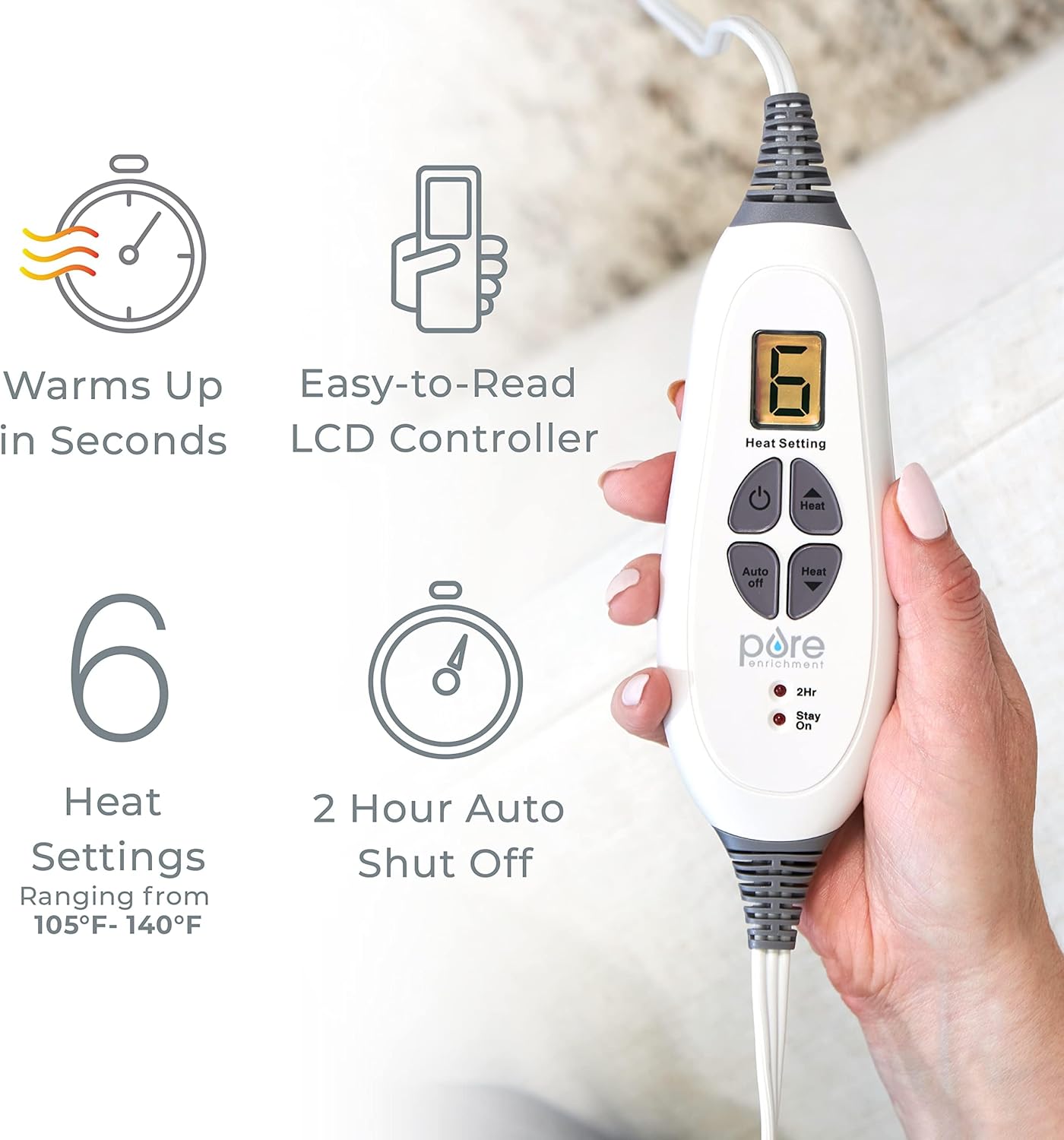 Extra-Long Cord: Relax on your bed, couch, or your favorite chair with the 9-foot power cord making it easy to adjust positions and pad placement with ease
